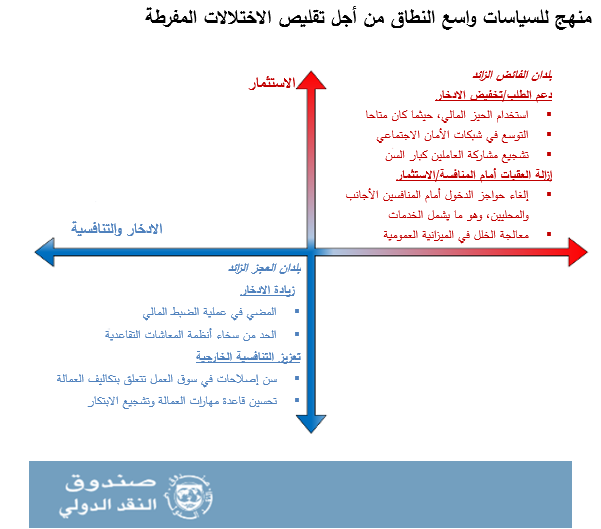 في الظرف الراهن، حيث اقتربت بلدان كثيرة من مستوى التشغيل الكامل وزاد ضيق حيز المناورة المتاح في ميزانياتها العمومية، ينبغي للحكومات أن تضبط سياساتها بدقة لتحقيق أهدافها الداخلية والخارجية، مع إعادة بناء هوامش الأمان في السياسة النقدية وسياسة المالية العامة. وعلى وجه الخصوص: