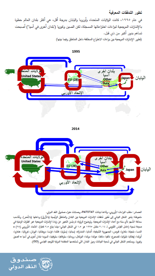 ويوضح الرسم البياني أن براءات اختراع الولايات المتحدة وأوروبا واليابان كانت المصدر الأول الذي تم الاستشهاد به في عام 1995. وفي السنوات الأخيرة، قامت الصين وكوريا (المشار إليهما معا باعتبارهما بلدان آسيا الأخرى) بتكثيف استخدامها لرصيد المعرفة العالمي كما يتبين من اقتباساتها من براءات الاختراع السابقة. كذلك حدثت زيادة عامة في الروابط المعرفية بمرور الوقت، سواء داخل المناطق (الأسهم الحمراء) أو عبر المناطق (الأسهم الزرقاء).