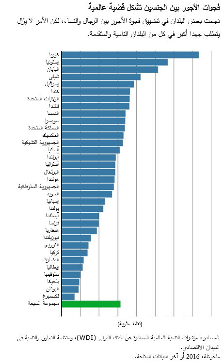 ويوضح الرسم البياني أن أبرز فجوة في الأجور هي الموجودة في كوريا الجنوبية حيث يبلغ الفرق بين أجور الرجال والنساء 37 نقطة مئوية. ويبلغ الفرق في الولايات المتحدة وكندا حوالي 18 نقطة مئوية، بينما يصل في لكسمبرغ إلى الطرف الأدنى على هذا المقياس، أي 3 نقاط مئوية. وفي مجموعة السبعة، التي أكدت بلدانها ضرورة سد الفجوة بين الجنسين وهي ملتزمة بتحقيق هذا الهدف، يبلغ متوسط فجوة الأجور حوالي 16 نقطة مئوية.