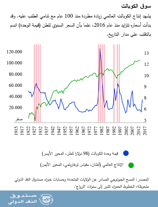 وقد اتسمت أسعار الكوبالت بالتقلب بسبب سلاسل العرض غير الآمنة. ويوضح الرسم البياني أيضا أن أسعاره سجلت أربع طفرات منذ عام 1915. وأدت الطفرتان اللتان حدثتا في 1978-1981 و 1995-1996 إلى ردود أفعال حادة. فقد ارتفع الإنتاج العالمي بنسبة 54.1% و 36.1% في 1983 و 1995، على الترتيب، وهو ارتفاع أعلى بكثير من متوسط الخمسين عاما الذي بلغ 4.8%. ويشير ارتفاع الأسعار منذ عام 2016 وأسعار العقود الآجلة للفترة 2018-2019 إلى احتمال أن يعيد التاريخ نفسه وإمكانية أن يتسارع الإنتاج مجددا، على الأقل بصفة مؤقتة. وقد حدث بعض الانخفاض في أسعار الكوبالت بالفعل في الشهور الأخيرة، عقب زيادات الإنتاج الكبيرة في جمهورية الكونغو الديمقراطية وانخفاض الطلب من الصين.