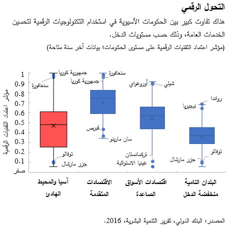وأخيراً، فقد حققت بعض البلدان قفزة إلى الأمام، بينما لا تزال بلدان أخرى متأخرة عن الركب. وتصنف كوريا وسنغافورة واليابان وماليزيا بين أفضل 10 حكومات رقمية على مستوى العالم. وتتفوق الهند على الاقتصادات المتقدمة، في المتوسط، بينما تتفوق الصين وسري لانكا وإندونيسيا وتايلند على نظرائها في الأسواق الصاعدة.