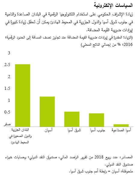 ومع زيادة التقدم في الرقمنة، يمكن أيضاً تحسين تحصيل الضرائب ومن ثم زيادة الإيرادات، لأن الرقمنة تسهل على الحكومات جمع البيانات المتعلقة بالمعاملات المالية. وينطبق هذا على الاقتصادات النامية والصاعدة بشكل خاص، إذ أن تجاوُز نصف المسافة إلى حدود الرقمنة يمكن أن يحقق لاقتصادات آسيان زيادة تعادل 1% من إجمالي الناتج المحلي في إيرادات ضريبة القيمة المضافة.