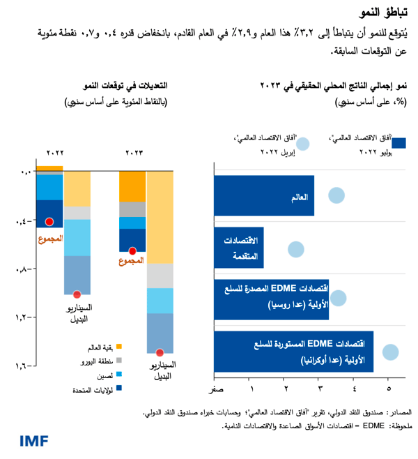 وحسب تنبؤاتنا الأساسية، يتباطأ النمو من 6,1% في العام الماضي إلى 3,2% هذا العام و2,9% في العام القادم، بانخفاض قدره 0,4 و0,7 نقطة مئوية عن تنبؤاتنا في إبريل. ويأتي ذلك تأثراً بتباطؤ النمو في أكبر ثلاثة اقتصادات في العالم – الولايات المتحدة والصين ومنطقة اليورو – مع تداعيات مهمة على الآفاق العالمية.