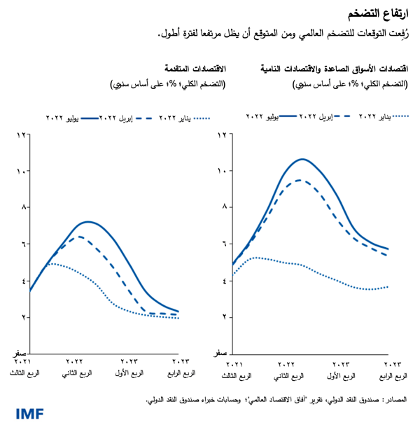 ورغم تباطؤ النشاط، فقد رفعنا توقعاتنا للتضخم العالمي، وذلك لأسباب منها ارتفاع أسعار الغذاء والوقود. فمن المتوقع أن يصل التضخم هذا العام إلى 6,6% في الاقتصادات المتقدمة و9,5% في اقتصادات الأسواق الصاعدة والاقتصادات النامية – بزيادة في التوقعات قدرها 0,9 و0,8 نقطة مئوية، على الترتيب – ومن المتوقع أن يظل مرتفعا لفترة أطول. وقد اتسع نطاق التضخم أيضا في كثير من الاقتصادات، انعكاسا لتأثير ضغوط التكلفة الناجمة عن انقطاعات سلاسل الإمداد وضيق أسواق العمل بالمعايير التاريخية.