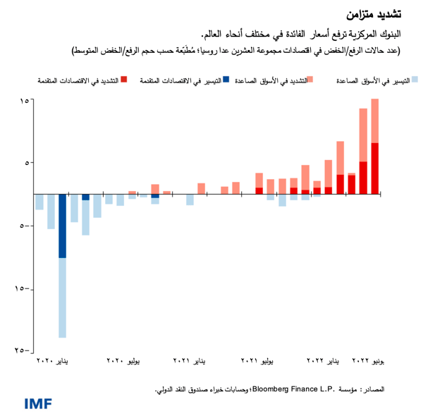 ونتج عن ذلك تشديد السياسة النقدية عبر البلدان بصورة متزامنة غير مسبوقة تاريخيا، ومن المتوقع أن يكون تأثير هذا التشديد قاسيا، حيث تتراجع معدلات النمو العالمي في العام القادم وتتباطأ معدلات التضخم. وسيكون لتشديد السياسة النقدية تكاليف اقتصادية حقيقية لا مفر منها، ولكن التأخر في هذا الإجراء لن يؤدي إلا إلى تفاقم المصاعب. وينبغي للبنوك المركزية التي بدأت تشديد سياستها النقدية أن تستمر على هذا المسار إلى أن يتم ترويض التضخم.