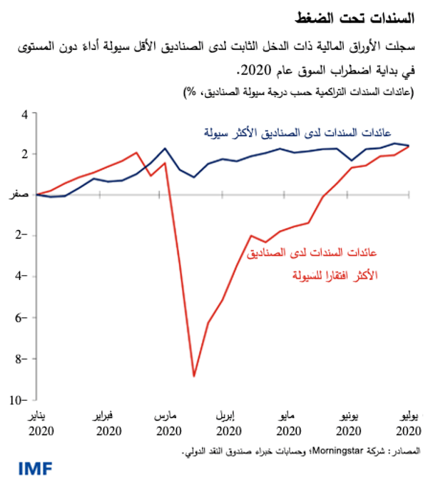 وهكذا، نجد أن الأصول مثل سندات الشركات لدى صناديق الاستثمار المفتوح التي تضم محافظها أصولا أقل سيولة قد هبطت قيمتها بدرجة أكثر حدة مقارنة بالأصول لدى الصناديق السائلة. وفرضت هذه الاختلالات خطرا جسيما على الاستقرار المالي، ولم تتم معالجتها إلا بعد تدخل البنوك المركزية بشراء سندات الشركات واتخاذ إجراءات أخرى.