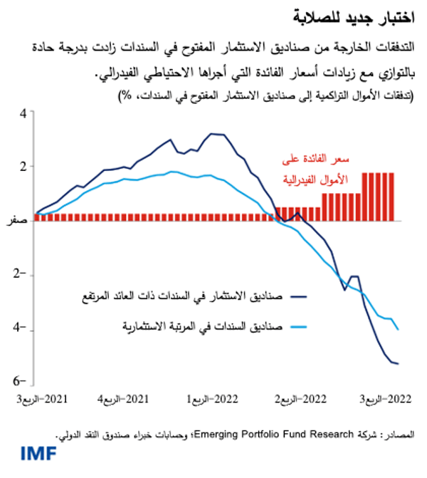 والآن قد تتعرض صلابة قطاع صناديق الاستثمار المفتوح للاختبار مرة أخرى، وهذه المرة في ظل تصاعد أسعار الفائدة وارتفاع عدم اليقين الاقتصادي. فقد شهدت الشهور الأخيرة تدفقات خارجة من صناديق الاستثمار المفتوح في السندات، ومن الممكن أن تؤدي صدمة مفاجئة سلبية مثل التشديد غير المنظم للأوضاع المالية إلى زيادة هذه التدفقات وتكثيف الضغوط في أسواق الأصول.