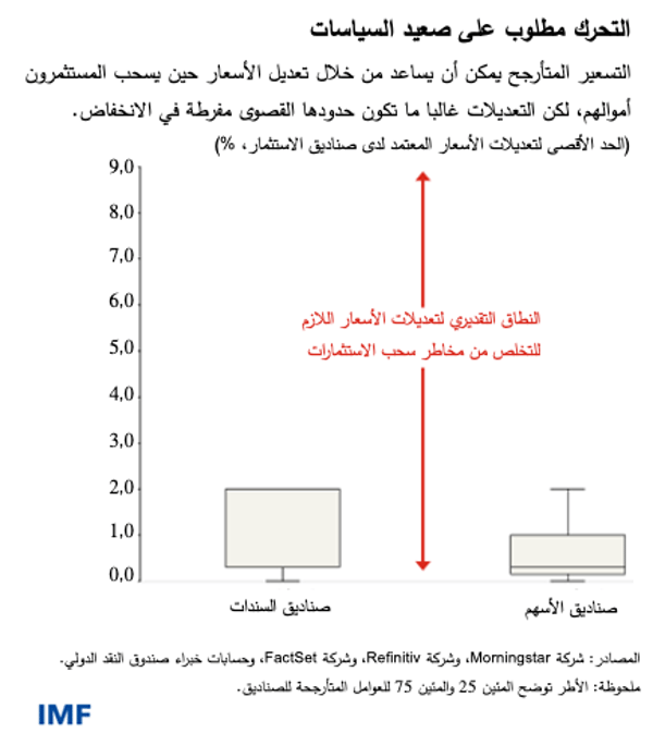 كما نشير في الفصل، يمكن الحد من تقلب الأصول الناشئ عن صناديق الاستثمار المفتوح إذا قامت هذه الصناديق بنقل تكاليف المعاملات إلى المستثمرين المنسحبين. فعلى سبيل المثال، من خلال ما يعرف باسم "التسعير المتأرجح"، تستطيع صناديق الاستثمار تخفيض سعر نهاية اليوم عند مواجهة تدفقات خارجة. ويحد هذا من حافز المستثمرين لاسترداد أموالهم قبل الآخرين. ويؤدي هذا إلى تخفيف ضغوط التدفقات الخارجة التي تواجه الصناديق في فترات الضغط، والحد من احتمالات البيع الاضطراري للأصول.