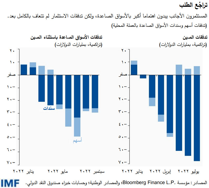 ولا يزال المستثمرون يميزون بين اقتصادات الأسواق الصاعدة. وبينما يتعرض كثير من الأسواق الواعدة لمخاطر التعثر في سداد الدين السيادي، يبدو أن عددا كبيرا من الأسواق الصاعدة الكبرى يتمتع بقدر أكبر من الصلابة في مواجهة مكامن الخطر الخارجية حتى الآن. ومع ذلك، فبعد استقرار التدفقات الخارجة في النصف الأول من العام، بدأ المستثمرون الأجانب في الانسحاب من جديد.