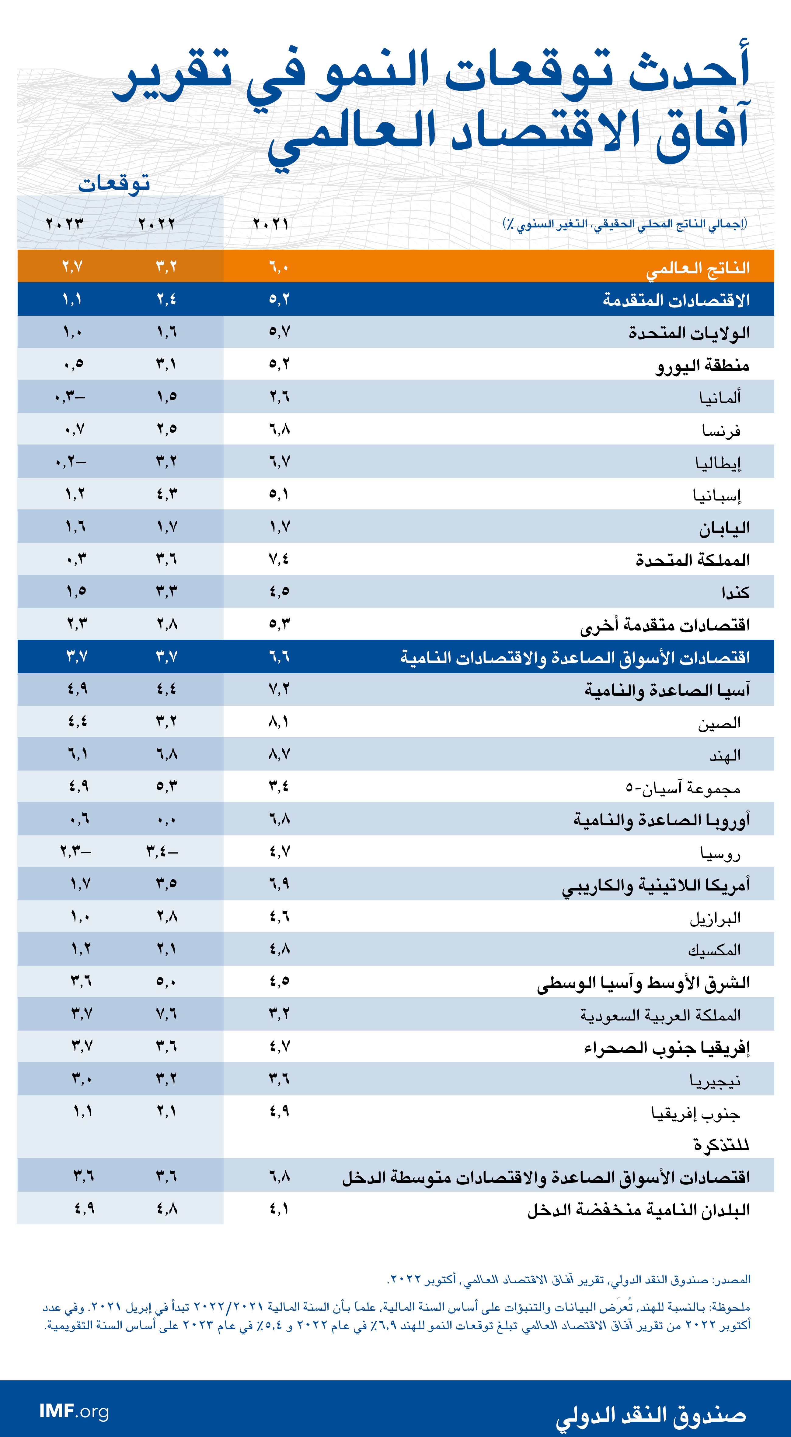 وفي الولايات المتحدة، سيؤدي تشديد الأوضاع النقدية والمالية إلى إبطاء النمو إلى 1% في العام القادم. وفي الصين، تم تخفيض تنبؤات النمو للعام القادم إلى 4,4% بسبب تراجع قطاع العقارات والإغلاقات العامة المتكررة.