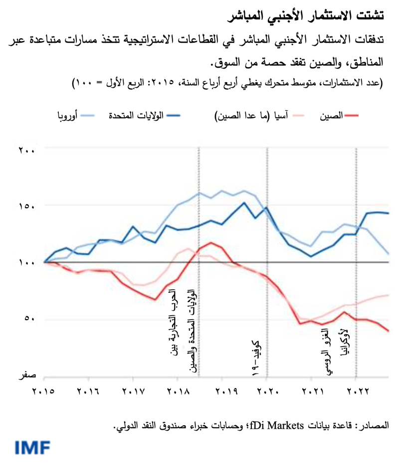 وتلقي هذه الأمثلة الضوء على الاتجاه الصاعد للتشتت الجغرافي-الاقتصادي، كما نبين في أحد الفصول التحليلية في آخر إصداراتنا من تقرير آفاق الاقتصاد العالمي. ويوضح تحليلنا لتأثير ذلك على الاستثمار الأجنبي المباشر أن هذه التدفقات قد اتسمت بأنماط متباعدة عبر البلدان المضيفة، ولا سيما في القطاعات الاستراتيجية، مثل أشباه الموصلات. وكان تدفق الاستثمار الأجنبي المباشر الاستراتيجي إلى البلدان الآسيوية قد بدأ يتراجع في عام 2019 ولم يتعاف إلا بصورة طفيفة في أرباع السنة الأخيرة، ما عدا التدفقات إلى الصين التي لم تتعاف بعد.