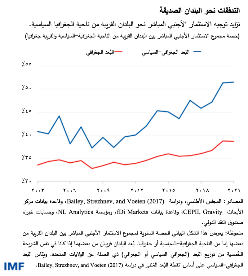 وعلى مدار العقد الأخير، استمر الارتفاع في حصة تدفقات الاستثمار الأجنبي المباشر بين الاقتصادات المتحالفة من الناحية الجغرافية-السياسية، بقدر أكبر من حصة البلدان الأقرب إلى بعضها جغرافيا، وهو ما يشير إلى أن التفضيلات الجغرافية–السياسية تدفع البصمة الجغرافية للاستثمار الأجنبي المباشر بصورة متزايدة.