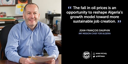 "هبوط أسعار النفط يمثل فرصة لإعادة تشكيل نموذج النمو الجزائري بحيث يوفر فرص عمل على أساس أكثر استمرارية." – جون-فرانسوا دوفان، رئيس بعثة الصندوق المعنية بالجزائر.