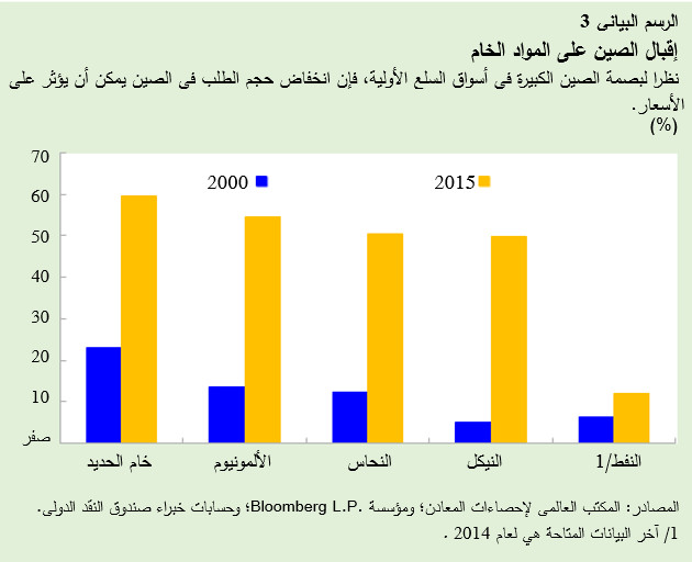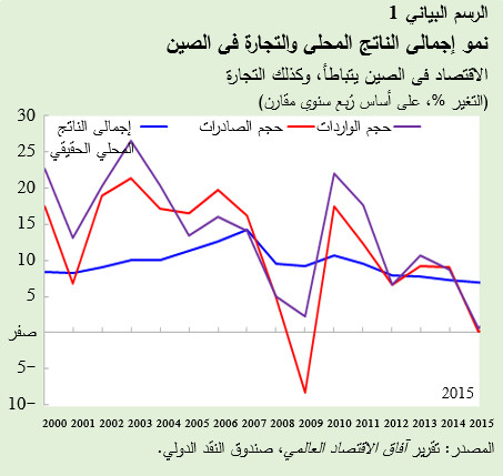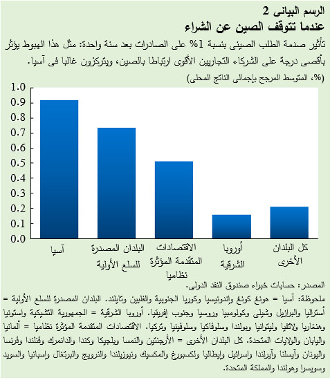 على غرار ما حدث في الماضي عندما أدى النمو السريع في الصين إلى تشجيع النمو العالمي، فإن التباطؤ الجاري واستعادة التوازن نحو الاستهلاك المحلي في الصين يترك أثره في الوقت الحالي أيضا من خلال ثلاث قنوات بصفة أساسية. أولا، من خلال التجارة: فالبلدان المصدرة للآلات والمواد الخام إلى الصين تشهد انخفاض الإقبال على منتجاتها وسلعها الأولية – مما يلحق الضرر البالغ بالبلدان الموّردة في آسيا على وجه الخصوص. ثانيا، من خلال أسعار السلع الأولية: فبالنظر إلى حصة الصين الكبيرة في الاستهلاك العالمي من المعادن والنفط، يمكن أن يؤدي انخفاض الطلب إلى خفض الأسعار. ثالثا، من خلال القنوات المالية: فمن شأن تفاعل أسعار الأصول في البلدان الأخرى للأحداث الجارية في الصين أن يؤدي إلى تضخيم التداعيات.
