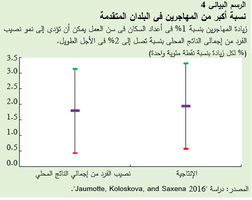 - زيادة نسبة العمالة المهاجرة بمقدار نقطة مئوية واحدة تؤدي إلى زيادة قدرها نقطتين مئويتين في إجمالي الناتج المحلي على المدى الطويل
