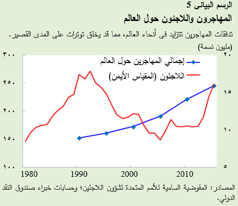 وفي البلدان المضيفة، يمكن لقدوم المهاجرين أن يحفز من نشوء التوترات الاجتماعية، والمخاوف الأمنية، بل وحتى ردود أفعال سياسية مفاجئة. غير أن الهجرة، كما يتضح من الدراسة، يمكن كذلك أن تحقق مكاسب اقتصادية من حيث رفع معدلات النمو والإنتاجية. وبالإضافة إلى ذلك، فإن المهاجرين – وغالبيتهم في سن العمل – يمكن أن يخففوا قليلا من أثر شيخوخة السكان في هذه البلدان.