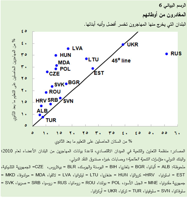 ففي بلدان المنشأ، نجد أن هجرة الشباب والمتعلمين سعيا وراء الفرص الاقتصادية الأفضل يمكن أن تؤثر على النمو في الأجل الطويل. فخسائر رأس المال البشري تعني انخفاض الإنتاجية، وتدهور التركيبة المهارية، وتقليص الإيرادات الضريبية. ويمكن التخفيف من آثار بعض هذه الخسائر من خلال استخدام تحويلات العاملين في الخارج والاستعانة بشبكات مواطني الشتات – ولكن يتعين على هذه البلدان في نهاية المطاف أن تتعامل مع السبب وراء بدء سكانها التحرك في هذا الاتجاه.