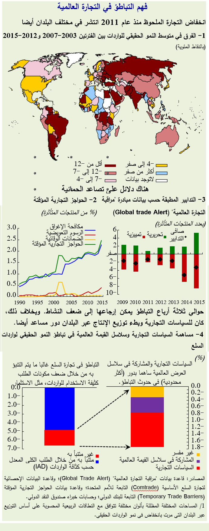 - تعطل تحرير التجارة، والزيادة الحادة في الحمائية مؤخرا، وتباطؤ توزيع الإنتاج عبر الحدود تتسبب أيضا في كبح التبادل التجاري ولكن بدرجة أقل