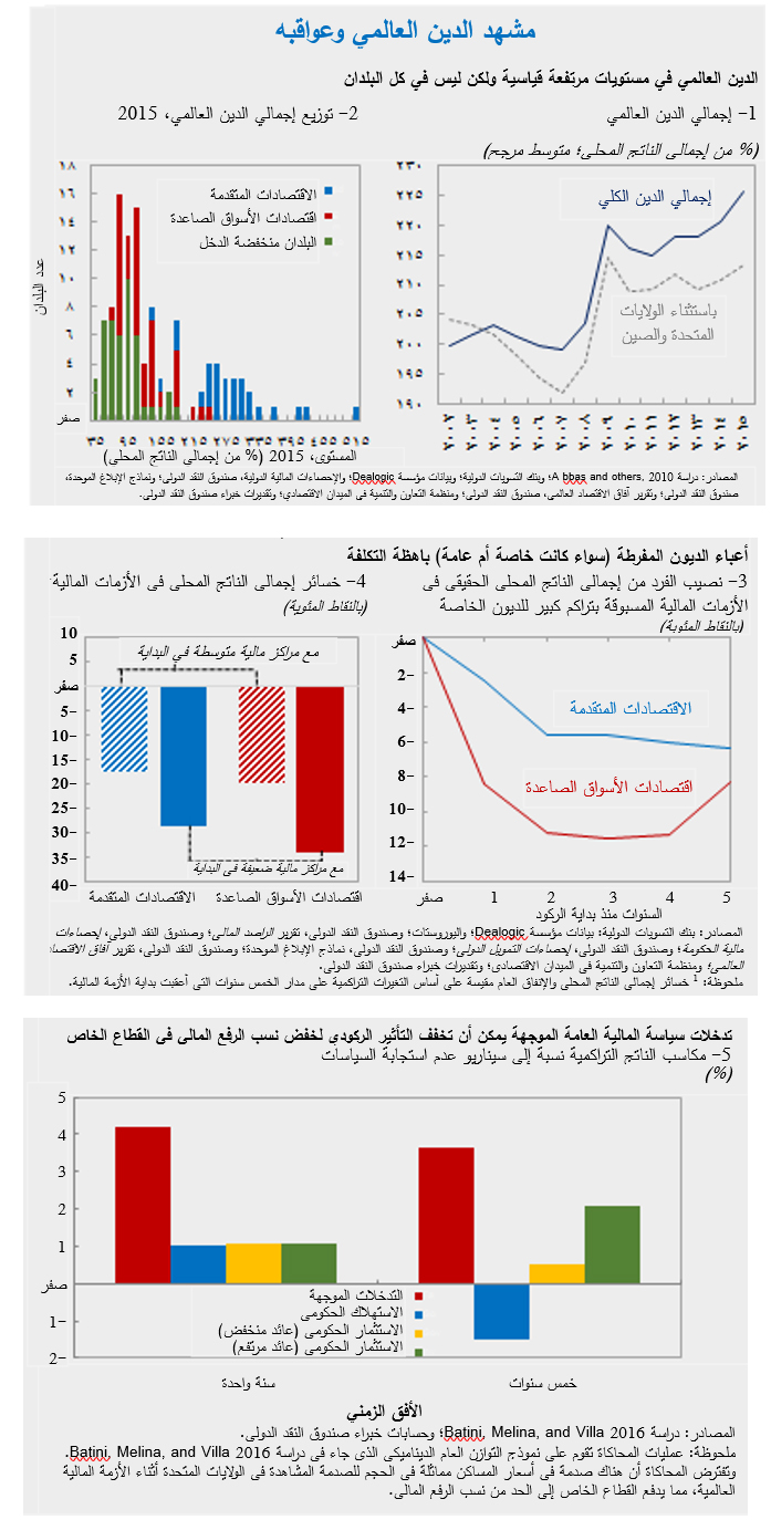 وقد استمر ارتفاع الدين العالمي عقب الأزمة المالية العالمية، حتى بلغ 225% من إجمالي الناتج المحلي العالمي مع نهاية 2015 (الرسم البياني 1). وتشكل التزامات القطاع الخاص حوالي الثلثين، أو قرابة 100 تريليون دولار أمريكي. وبالرغم من أن البلدان ليست جميعا في نفس المرحلة من دورة الدين، فإن مجرد حجم الدين العالمي ينشئ مخاطر تتعلق بخفض غير مسبوق لنسب الرفع المالي – أي تخفيض مستويات الدين – من شأنه الوقوف عائقا أمام النمو على مستوى العالم.