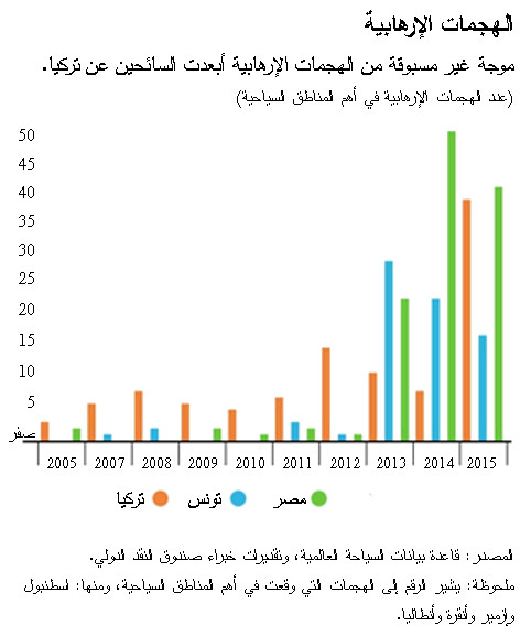 وجاء عام 2016 فشهدت تركيا زيادة حادة في الهجمات الإرهابية المصحوبة بعدم اليقين على الصعيد السياسي. ومع هذه الهجمات الإرهابية – التي بلغ عددها 400 حادثة في 2015 فقط من متوسط 70 بين عامي 2010 و 2014 – تراجع عدد السائحين الأوروبيين بأكثر من 30% بعد أن كانوا يشكلون أكثر من نصف عدد زوار تركيا. كذلك طال الهبوط الحاد تدفق السائحين من وجهة مهمة أخرى، هي روسيا، واقترن الهبوط بقيود على رحلات الطيران العارض ومبيعات خدمات السفر الشاملة.