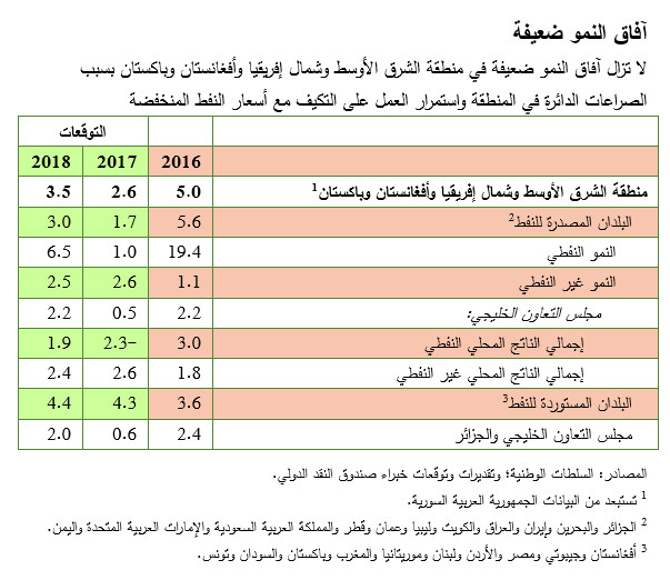 من المتوقع أن يصل انخفاض النمو الكلي إلى نهايته في البلدان المصدرة للنفط عند مستوى 1.7% في عام 2017، بسبب انخفاض إنتاج النفط وفقا للاتفاق الذي تقوده منظمة أوبك. وفي المقابل، من المتوقع أن يتعافى النمو غير النفطي مسجلاً 2.6% تقريبا في 2017 مع اعتماد وتيرة أبطأ في تخفيض عجز الموازنة.