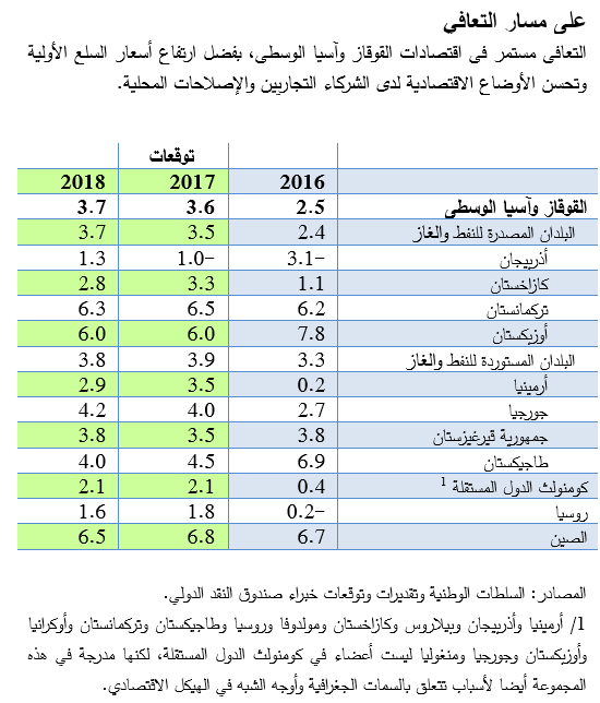 سيشهد نمو إجمالي الناتج المحلي انتعاشا في منطقة القوقاز وآسيا الوسطى مسجِّلاً 3.6% هذا العام بعد أن بلغ 2.5% في 2016، ثم يتسارع بالتدريج إلى 4.7% في 2022. ويرجع معظم هذا التحسن إلى الأداء الاقتصادي الأقوى لدى أهم الشركاء التجاريين، مثل الصين وروسيا، وارتفاع أسعار السلع الأولية الرئيسية، بما فيها النفط والنحاس والقطن والذهب.