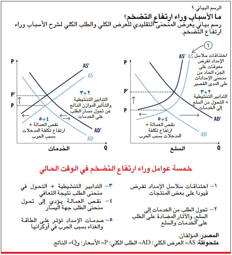 ونعرض هذه الآثار الخمسة بإيجاز باستخدام منحنيات العرض الكلي والطلب الكلي الكلاسيكية (انظر الرسم البياني 1). ورغم أن إطار العرض الكلي والطلب الكلي قد يبدو تقليديا، فإنه لا يزال مفيدا في تحليل الوضع الحالي. ويرصد الرسم البياني تأثير دوافع التضخم الخمسة على سوق السلع وسوق الخدمات كل على حدة.
