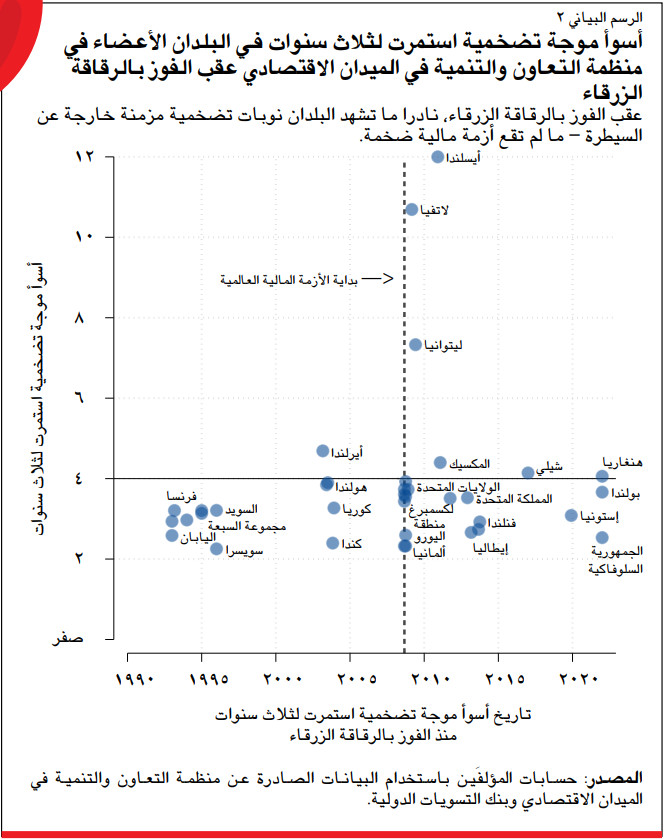 ويشير تحليلنا إلى أن البلدان التي استطاعت كبح جماح التضخم لم يشهد سوى عدد قليل منها لاحقا طفرة تضخمية مزمنة خارجة عن السيطرة. ويعني ذلك أن عددا قليلا فقط من البلدان سقط مجددا في براثن التضخم بعد الاستفاقة من الموجة التضخمية (أو بعد فترة متواصلة من الاستفاقة امتدت حتى بداية التسعينات). وجاء ذلك مدعوما أيضا بعدد من الإصلاحات المؤسسية التي أتاحت للبنوك المركزية القوة اللازمة لمواجهة الضغط من جانب السياسيين لدفع عجلة النمو من خلال زيادة التضخم في اللحظات المناسبة.