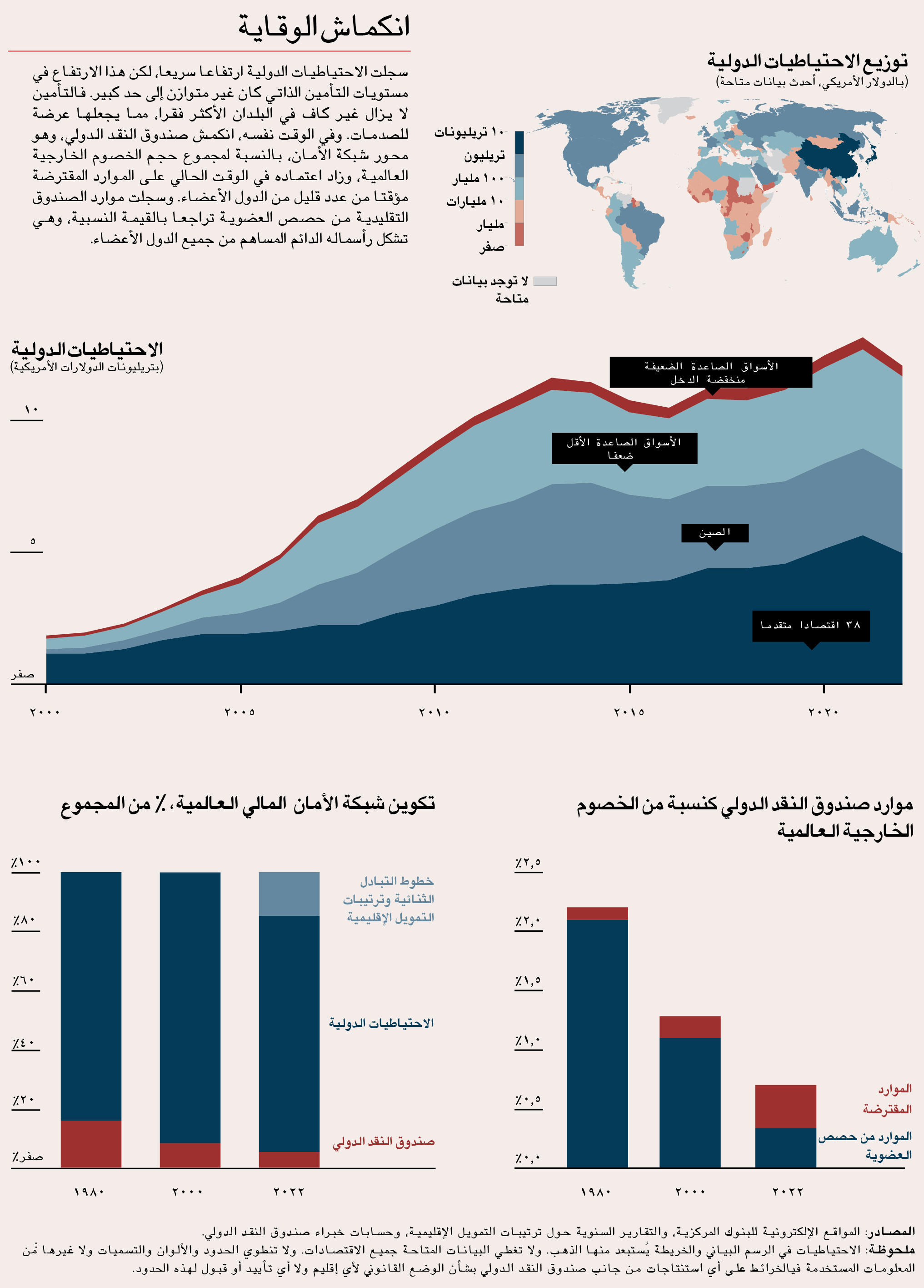 وتشكل الاحتياطيات الدولية خط الدفاع الأول خلال الأزمات، ولكنها غير موزعة على نحو متكافئ بسبب ارتفاع تكلفتها، حيث يتركز الجزء الأكبر منها في الاقتصادات المتقدمة واقتصادات الأسواق الصاعدة الأكبر حجما.