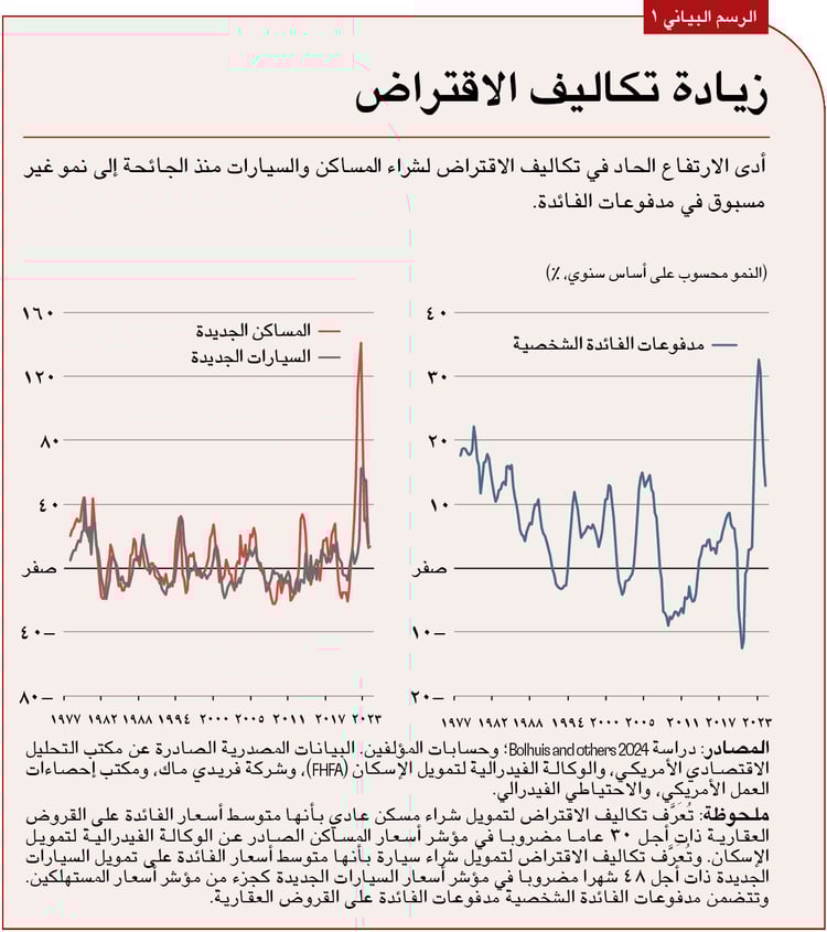 فبالنسبة للمستهلكين، تشكل تكلفة الأموال جزءا من تكلفة المعيشة. وبالتالي، مع ارتفاع أسعار الفائدة في النصف الثاني من عام 2023 إلى أعلى مستوياتها منذ 20 عاما، شعر المستهلكون بالضائقة المالية. ولا تزال أسعار المساكن في الولايات المتحدة مرتفعة بأكثر من 50% منذ بدء الجائحة، كما سجلت أسعار الفائدة على القروض العقارية ارتفاعا بمقدار الضعف تقريبا. وارتفعت مدفوعات الفائدة على القروض العقارية الجديدة بأجل 30 عاما للمنزل العادي بنحو ثلاثة أضعاف منذ نهاية عام 2019. وتضاعفت تقريبا مدفوعات الفائدة على القروض الجديدة لتمويل شراء سيارة. ونتيجة لذلك، ارتفعت مدفوعات الفائدة على الأسر بنحو 30% في عام 2023، وهو أسرع معدل على الإطلاق (راجع الرسم البياني 1).