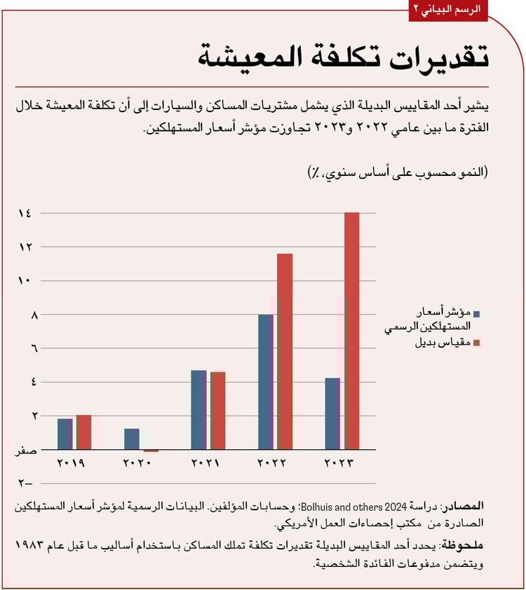 وأخيراً، نعرض مقاييس بديلة لتكلفة المعيشة تتضمن صراحة تكلفة الأموال. وتعتمد المنهجية الحالية لمكتب إحصاءات العمل على سوق الإيجارات وحدها لتفسير التغيرات في معادل الإيجار للمالكين (دراسة Bolhuis, Cramer, and Summers 2022). وقبل عام 1983، كان مؤشر أسعار المستهلكين يتضمن مقياسا لتكلفة تملك المساكن يعكس أسعار الفائدة على القروض العقارية وأسعار المساكن. وبالمثل، تستبعد الإحصاءات الرسمية تكاليف الاقتراض المتعلقة بالسيارات ومدفوعات الفائدة الشخصية الأخرى (على سبيل المثال، ديون بطاقات الائتمان) التي تعكس بشكل أفضل التكاليف الفعلية التي يتحملها المستهلكون.