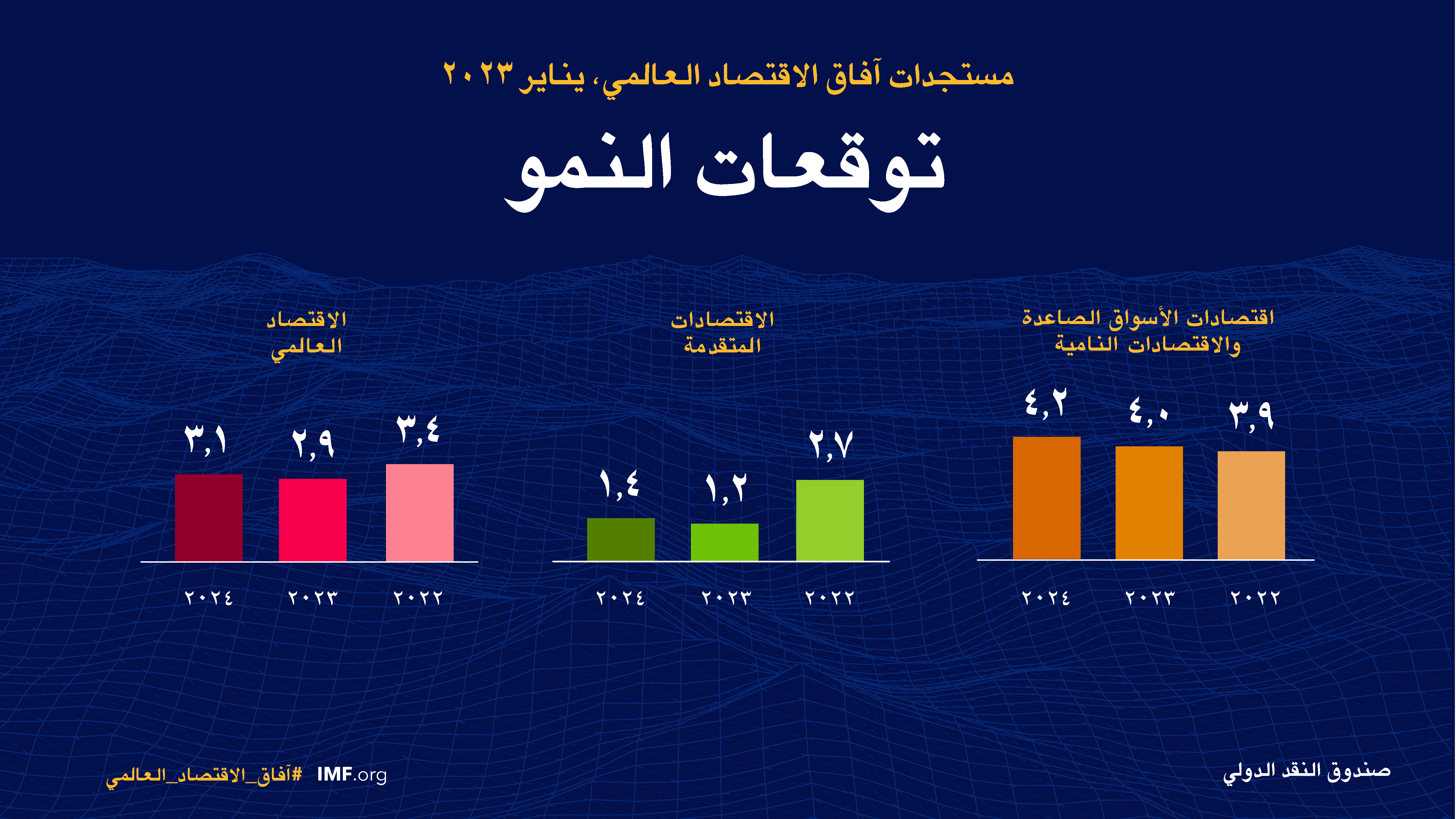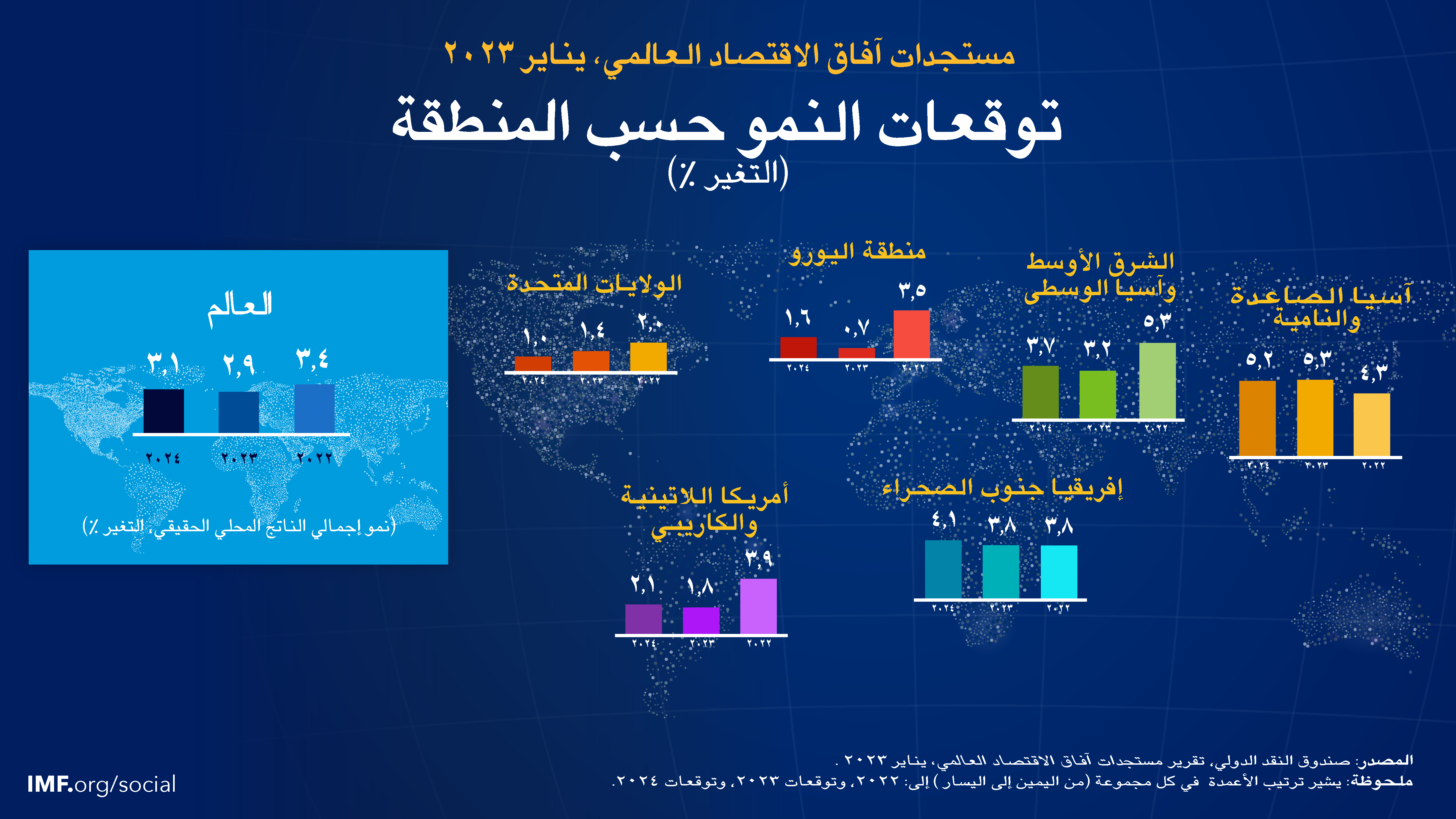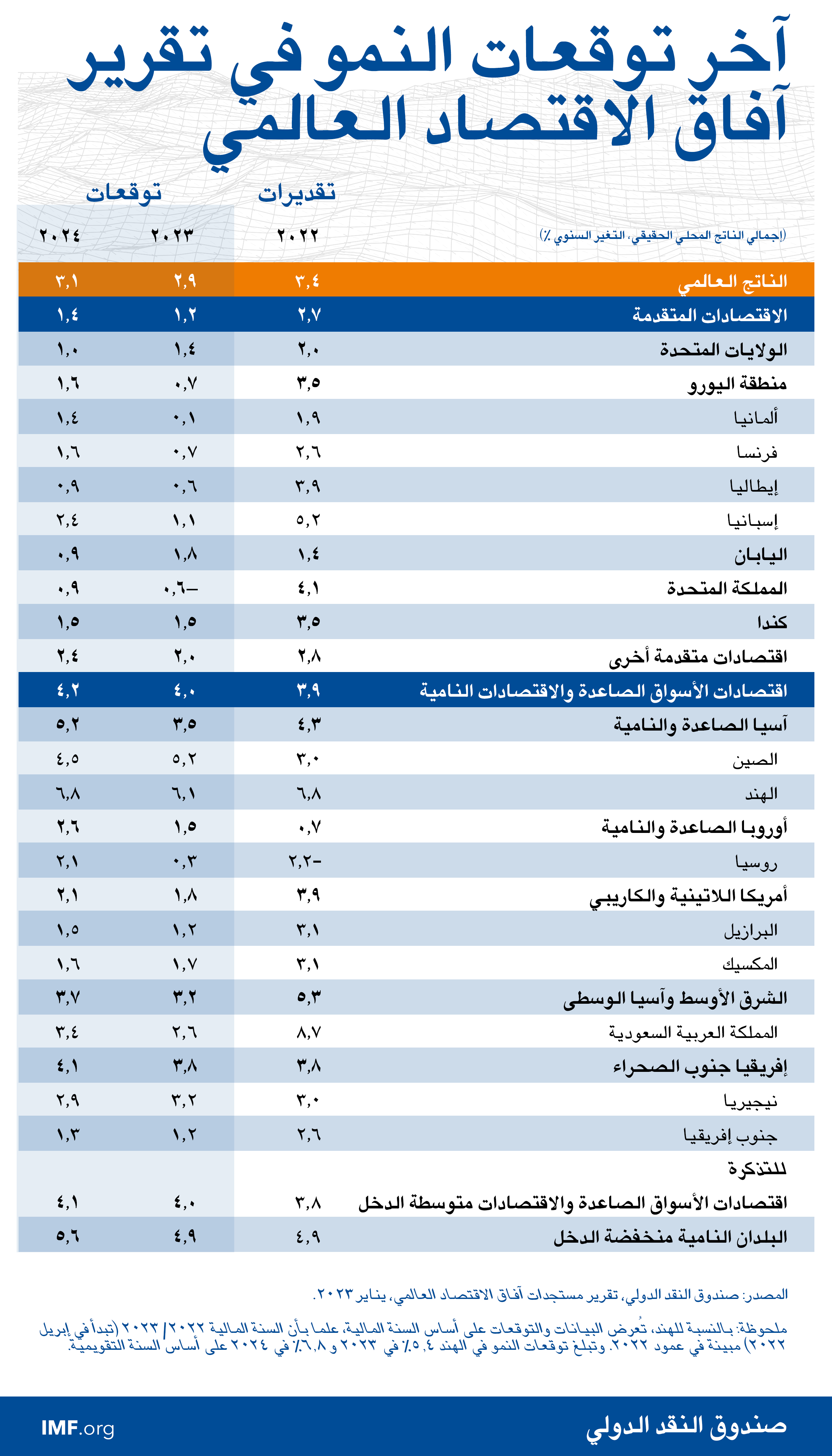 من المتوقع أن ينخفض النمو العالمي من 3,4% في عام 2022 حسب التقديرات إلى 2,9% في 2023 ثم يرتفع إلى 3,1% في 2024. وتمثل تنبؤات عام 2023 ارتفاعا بمقدار 0,2 نقطة مئوية عما كان متوقعا في عدد أكتوبر 2022 من تقرير "آفاق الاقتصاد العالمي" وإن كانت أقل من المتوسط التاريخي البالغ 3,8% (من 2000–2019). ولا يزال النشاط الاقتصادي يعاني تحت وطأة رفع البنوك المركزية لأسعار الفائدة من أجل مكافحة التضخم والحرب الروسية في أوكرانيا. وقد أدت سرعة انتشار مرض كوفيد-19 في الصين إلى إضعاف النمو في عام 2022، ولكن إعادة فتح الاقتصاد مؤخرا مهدت سبيل التعافي بوتيرة أسرع مما كان متوقعا. وتشير التوقعات إلى انخفاض التضخم العالمي من 8,8% في عام 2022 إلى 6,6% في 2023 و4,3% في 2024، وهما نسبتان تظلان أعلى من مستويات ما قبل الجائحة (من 2017–2019) بنحو 3,5%.