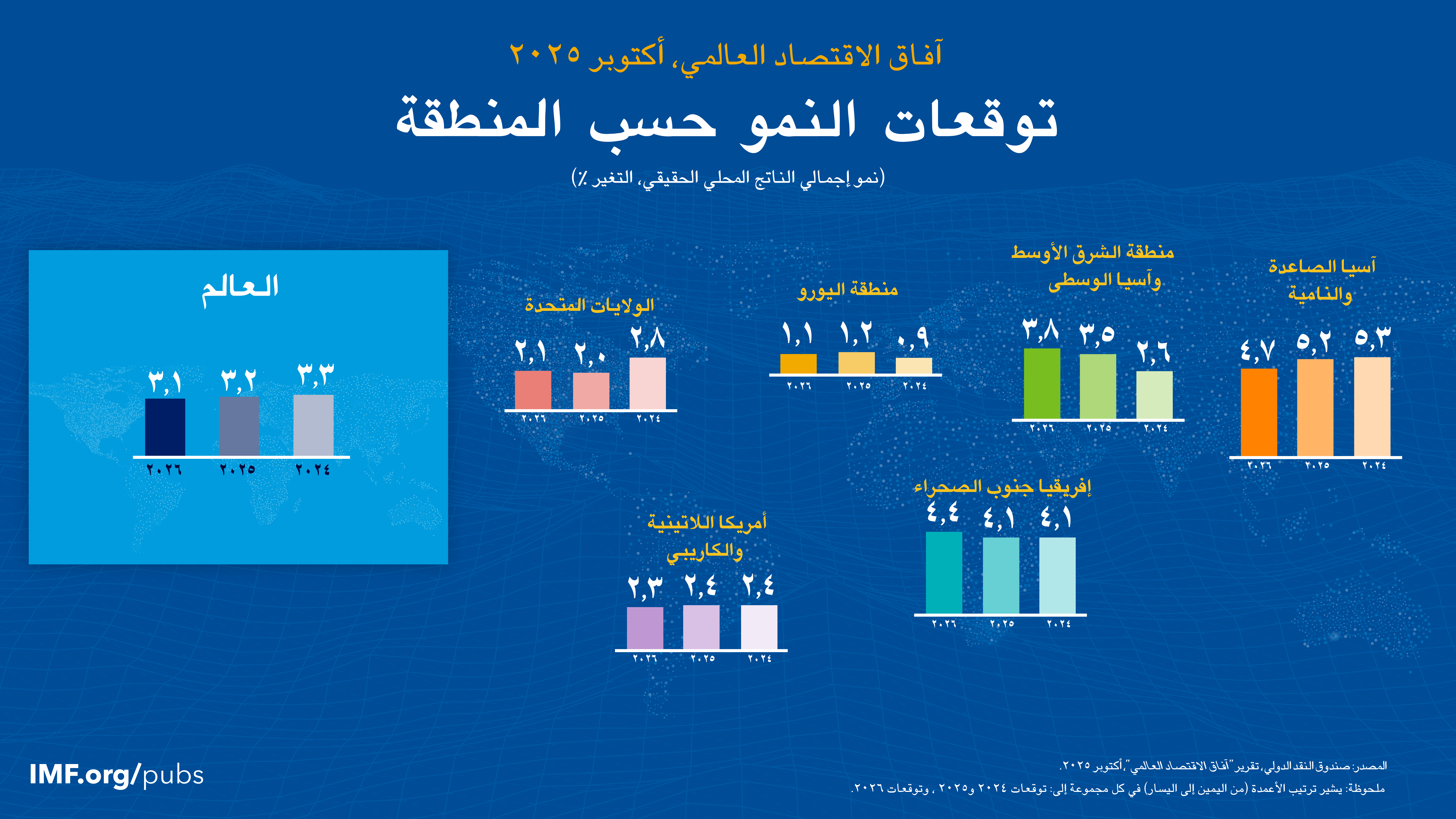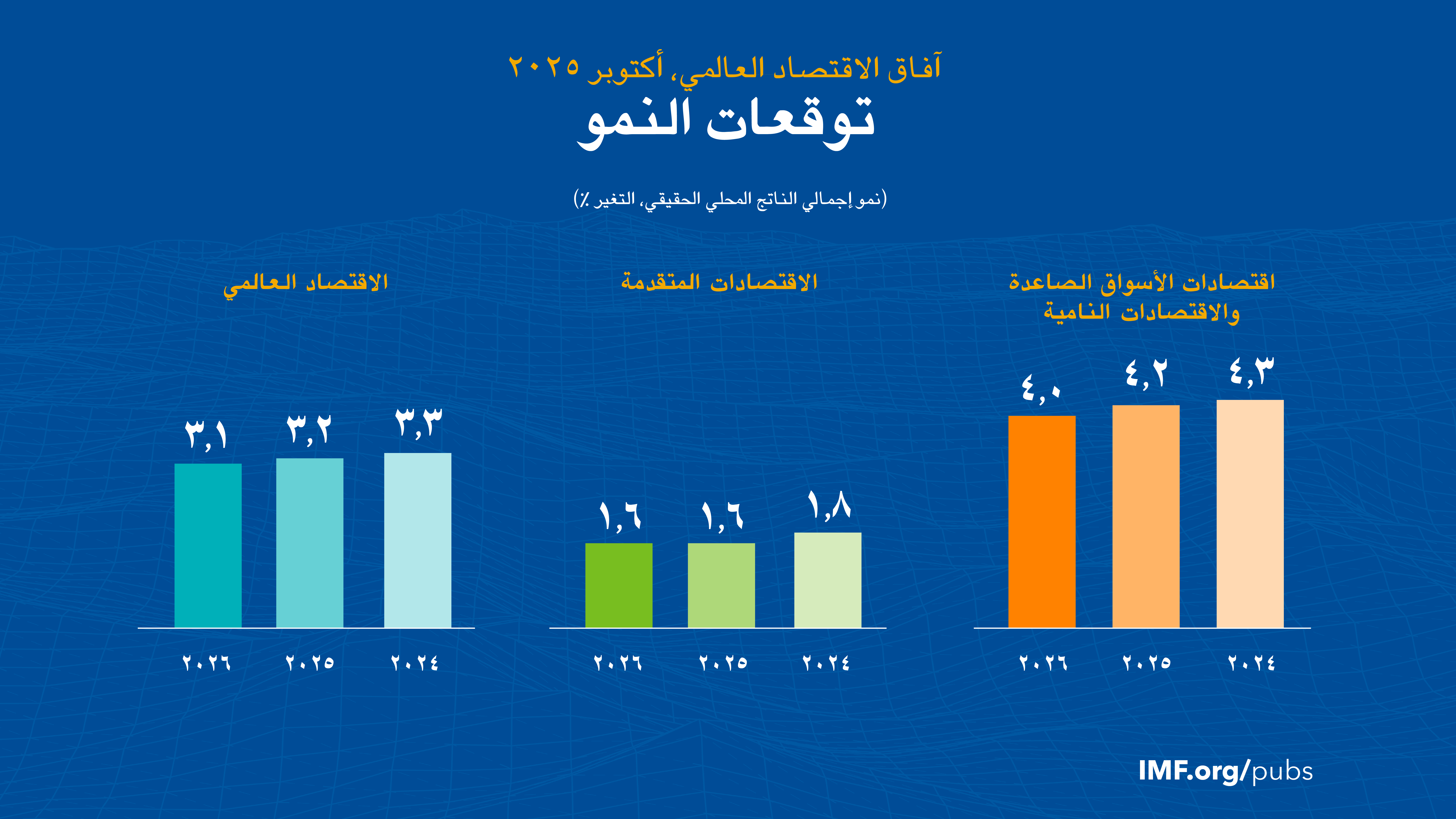 ونتيجة لذلك، ارتفعت توقعات النمو العالمي في أحدث عدد من تقرير آفاق الاقتصاد العالمي مقارنة بعدد إبريل 2025 من التقرير ولكنها لا تزال دون تنبؤات مرحلة ما قبل تحول السياسات. فتشير التوقعات إلى تباطؤ النمو العالمي من 3,3% في عام 2024 إلى 3,2% في عام 2025 و3,1% في عام 2026، مع بلوغ معدل النمو نحو 1,5% في الاقتصادات المتقدمة وأعلى قليلا من 4% في اقتصادات الأسواق الصاعدة والاقتصادات النامية. ويُتوقع استمرار تراجع التضخم عالميا، مع وجود بعض التفاوتات عبر البلدان، حيث يتجاوز المستهدف في الولايات المتحدة – في ظل احتمالات بتجاوز التوقعات – ويواصل انخفاضه في بلدان أخرى.