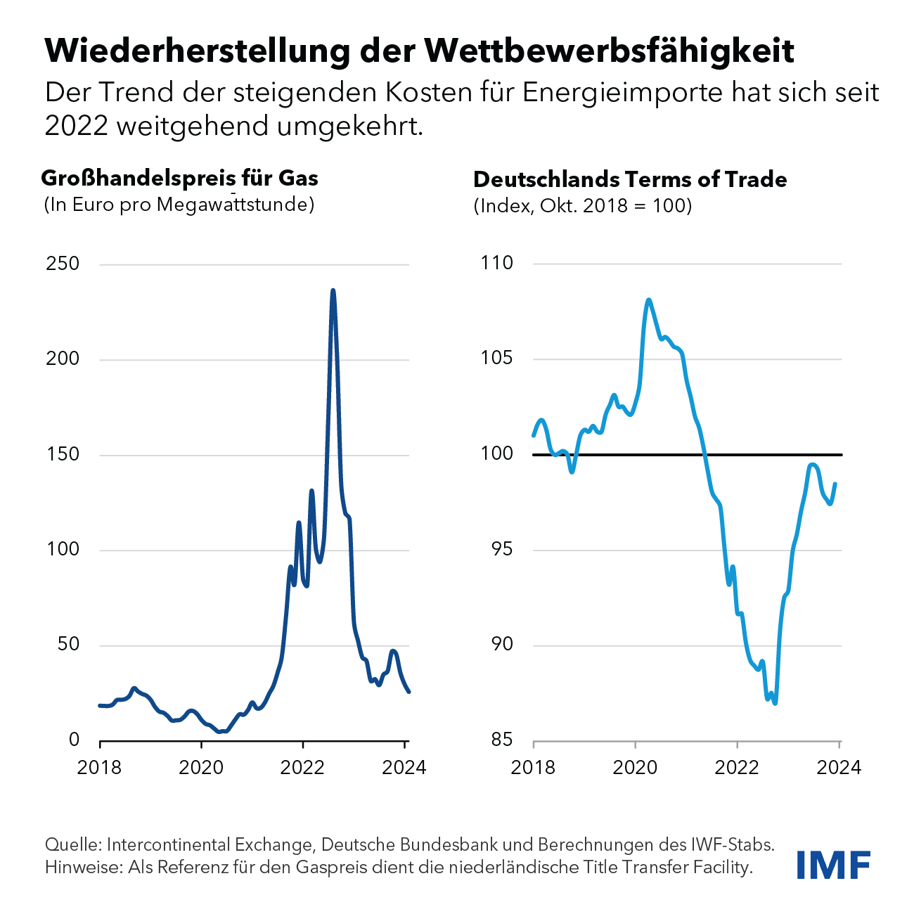 Allgemeine Kennzahlen zur internationalen Wettbewerbsfähigkeit Deutschlands zeichnen ein ähnliches Bild und signalisieren eine deutliche Erholung: Deutschlands Terms of Trade (Verhältnis von Ausfuhrwerten zu den Einfuhrwerten) liegen wieder auf demselben Niveau wie vor dem Energiepreisschock. Und Deutschlands Handelsbilanzüberschuss betrug im vergangenen Jahr 4,3 Prozent des BIP – ein Wert, der zwar hinter den übermäßig hohen Überschüssen der Vor-Corona-Jahre zurückbleibt, doch über dem Durchschnitt der letzten zwei Jahrzehnte liegt – und dieses Jahr weiter steigen dürfte.
