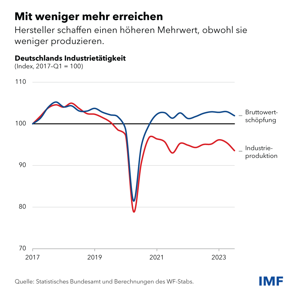 Deutsche Produzenten passten sich auch an die Energiekrise und die Lieferkettenstörungen an, indem sie Produkte mit höherem Mehrwert erzeugten und weniger Zwischenprodukte einsetzten. Greg Fuzesi von J.P. Morgan und andere kommen zu dem Schluss, dass der in der Produktion geschaffene Mehrwert stabil geblieben ist, obwohl die industrielle Produktion gesunken ist. Anders ausgedrückt: Die industrielle Produktion ist als Messgröße für die gesamte wirtschaftliche Leistung einer Volkswirtschaft inzwischen weniger gut geeignet.