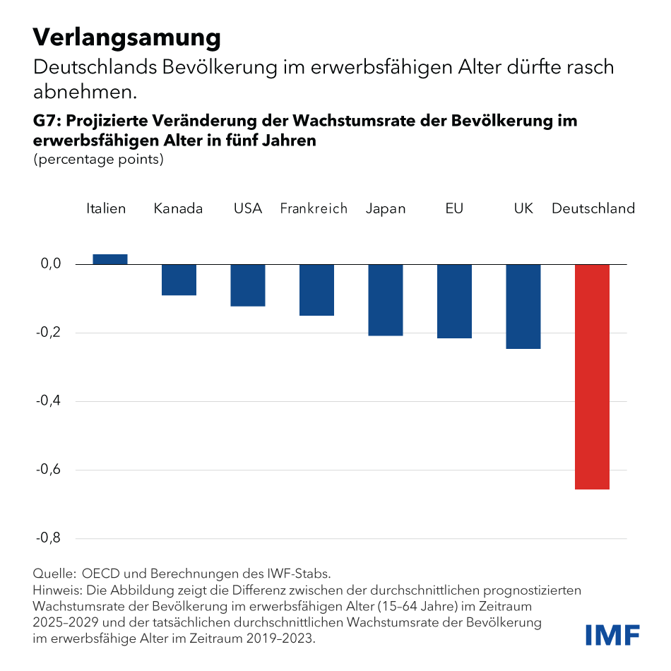 Deutschlands Bevölkerung im erwerbsfähigen Alter ist in den letzten zehn Jahren durch Einwanderung gewachsen. Es handelte sich dabei hauptsächlich um Flüchtlinge, die vor regionalen Konflikten flohen. Mit dem Abebben dieser Flüchtlingswelle und der Pensionierung der Babyboomer in den kommenden fünf Jahren wird das Wachstum der Erwerbsbevölkerung in Deutschland stärker zurückgehen als in den übrigen Ländern der G7. Dies wird Abwärtsdruck auf das BIP pro Person ausüben, denn auf jeden Rentner kommen weniger Erwerbstätige. Ohne Reformen wird dies auch zu höheren Sozialversicherungsbeiträgen gepaart mit niedrigeren Renten führen. Außerdem lässt eine zunehmend alte Bevölkerung die Nachfrage nach Gesundheitsdienstleistungen steigen, wodurch Arbeitskräfte aus anderen Branchen abgezogen werden. Ein Mangel an Arbeitskräften könnte auch Investitionen verhindern.