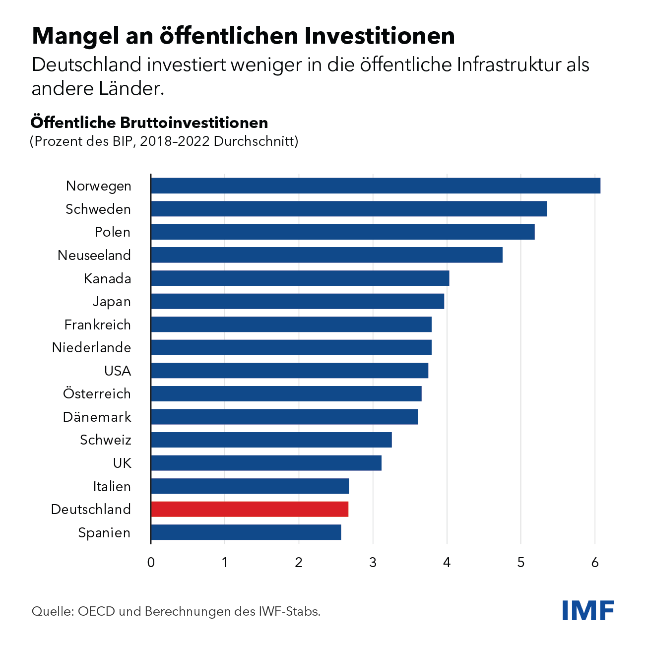 Eine andere Lösung besteht darin, die Produktivität zu steigern, die durch unzureichende Investitionen in die öffentliche Infrastruktur beeinträchtigt wurde. Öffentliche Investitionen waren in den 1990er-Jahren rückläufig und sind seitdem gerade so ausreichend, um die Abschreibungen auszugleichen. In Bezug auf öffentliche Investitionen schneidet Deutschland im Vergleich zu anderen Industrieländern eher schlecht ab. Für Investitionen vorgesehene Mittel werden regelmäßig nicht ausgeschöpft, was häufig auf Personalmangel in den Kommunen zurückzuführen ist.
