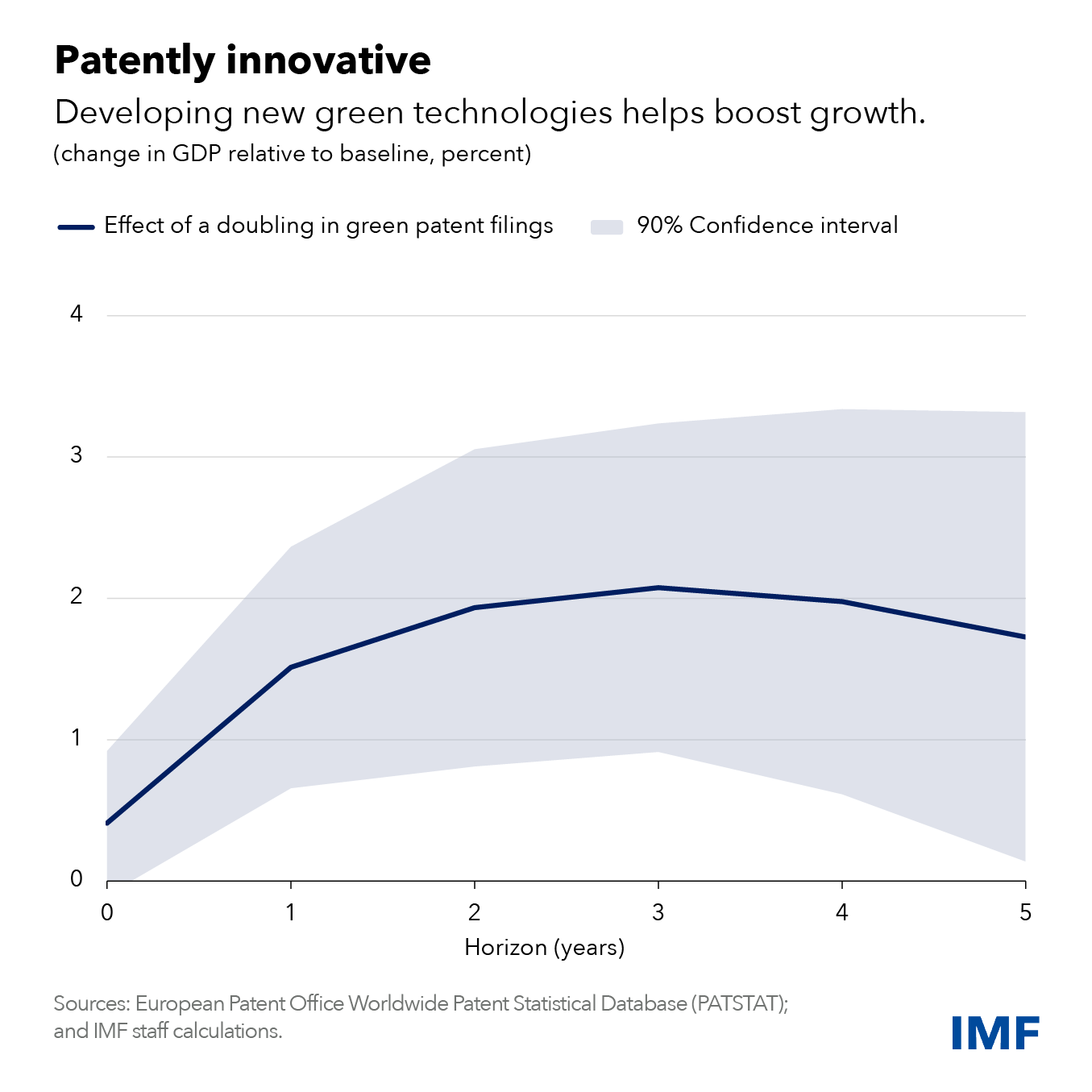 Our research shows that doubling green patent filings can boost gross domestic product by 1.7 percent after five years compared with a baseline scenario. And that’s under our most conservative estimate—other estimates show up to four times the effect.