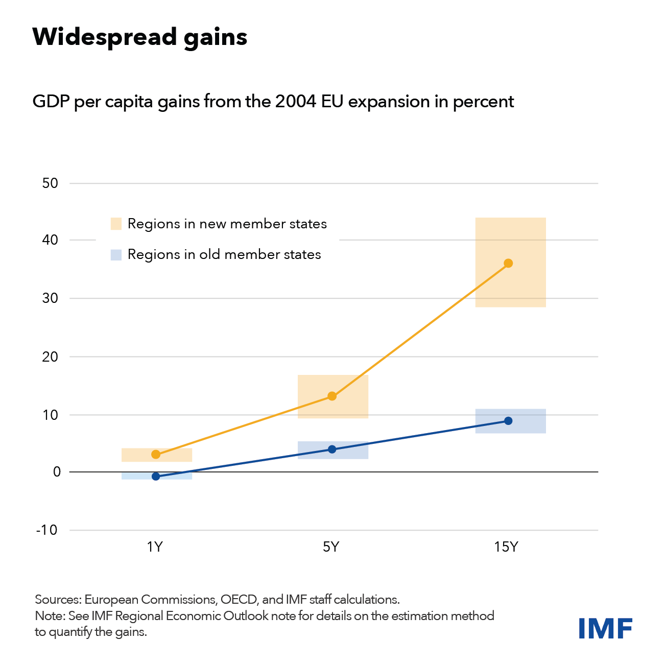 A new note by the Regional Economic Outlook for Europe shows that the 2004 EU enlargement brought substantial income gains. These gains were particularly large in the new member states: after 15 years GDP per person was on average more than 30 percent higher than it would have been without EU accession.