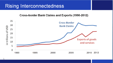 At the same time, trade and financial linkages have risen spectacularly. Cross-border bank claims grew from $6 to over $30 trillion between 1990 and 2008, and global merchandise exports of goods and services increased from $4 trillion to $20 trillion. While these numbers contracted somewhat in subsequent years due to the global crisis, the growth rates for the past 20 or 30 years are still impressive.