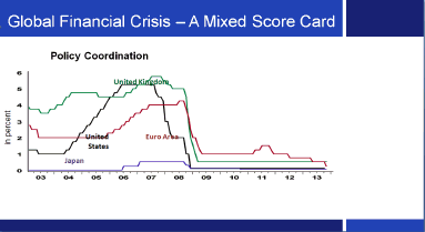First, macroeconomic policy coordination. Although not perfect, such coordination was particularly strong at the initial stage of the crisis. For instance, six major central banks announced, in an unprecedented move, a coordinated cut in policy rates in October 2008 to ease global economic conditions. The U.S Federal Reserve and 14 different monetary authorities established temporary U.S. currency swap arrangements to mitigate dollar shortages in short-term funding markets. And the first ever G20 Leaders’ Summit was convened in November 2008 and led to a commitment to coordinated fiscal stimulus and a pledge to refrain from protectionism.