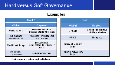 A parallel argument can be made for governance. “Hard” governance arrangements require the establishment of legal obligations and independent institutions through treaties. The UN, IMF, World Bank and the WTO typify such arrangements.