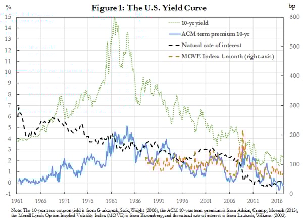 There are several salient features that warrant comment. First, the nominal rate rose from 4 percent in 1961 to a peak of 15 percent in 1982, before declining to below 2 percent in 2016. Some of that movement is closely associated with inflation. Second, the term premium rose from a level around 0 percent in 1961 to above 5 percent in 1985, and fell back to below 0 percent in 2016. The term premium spiked in 2008 during the global financial crisis. Third, the movements in volatility are tightly linked to the movements of the term premium. Fourth, the estimated level of the neutral rate exhibits a long term downward trend that is only tightly linked to the level of interest rates in recent years.