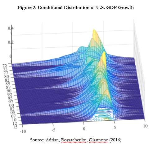 Let me illustrate this with one example, drawing on empirical work with Nina Boyarchenko and Domenico Giannone (2016). We ask to what extent financial conditions—a gauge of the pricing of risk—incorporate information about downside risk to GDP growth (see Figure 2). We find that financial conditions are very highly significant predictors of the conditional distribution of GDP, even after controlling for standard macroeconomic variables. At a one quarter or one year horizon, tight financial conditions forecast low GDP growth and high GDP variance, shifting the conditional GDP distribution to the left. This joint evolution of conditional means and variances generates a strongly skewed unconditional GDP distribution.