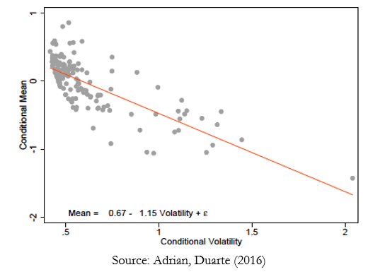 In macrofinance models, financial vulnerabilities act as amplifiers for underlying shocks or externalities (see Adrian, Covitz, Liang 2015 for an overview). Vulnerabilities such as leverage, maturity or liquidity transformation, or currency mismatches determine the level of conditional tail risks. Furthermore, in many economies, there exists a tradeoff between vulnerabilities and growth (Adrian, Stackman, Vogt 2016, Ranciere, Tornell, Westermann 2008). Importantly, the pricing of risk interacts with vulnerabilities to determine the level of tail risk. In general, in these models, a financial friction that gives rise to externalities or coordination failures can lead to too much or too little risk taking, so that the amount of tail risk that arises in equilibrium is generally not optimal. The monitoring of the pricing of risk and the level of vulnerabilities allows observers to quantify financial stability.