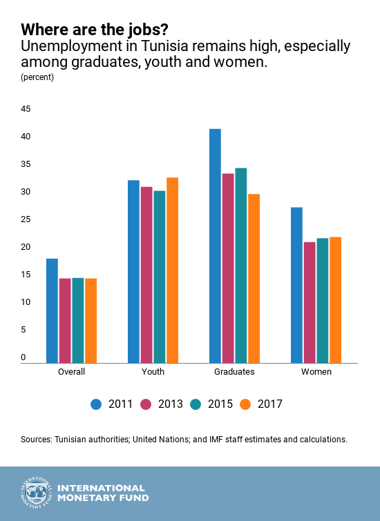 Strengthening governance and enforcement in the government’s anti-corruption fight, building a competitive business environment, implementing a fairly-valued exchange rate, providing investment incentives to increase productivity, and reducing red tape are all necessary to overcome investor reluctance and build confidence. Doing so will help unleash the potential of the private sector to generate more opportunity and jobs for all Tunisians.