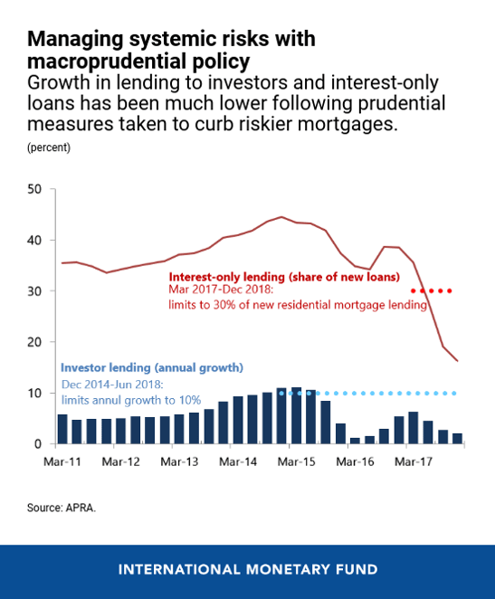 - Financial system resilience strengthened since the IMF’s 2012 assessment of Australia’s financial sector with the introduction of a number of measures including raising capital requirements of banks, taking steps to reduce their reliance on less stable sources of funding from global markets, introducing macroprudential measures to calm rapid growth in the riskier segments of the mortgage market, and enhancing the quality and effectiveness of financial supervision and systemic risk oversight. Tests conducted by the IMF’s 2018 financial sector assessment suggest that banks remain relatively resilient under conditions of economic and financial stress.