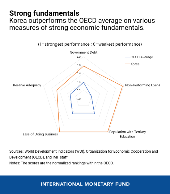 - Korea’s economy has strong fundamentals. The banking sector appears to be well capitalized with sizable liquidity buffers. Korea has substantial fiscal space to aim for a zero structural balance in the medium term without risking debt sustainability.