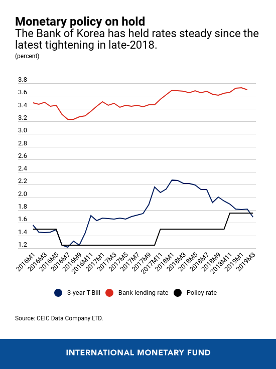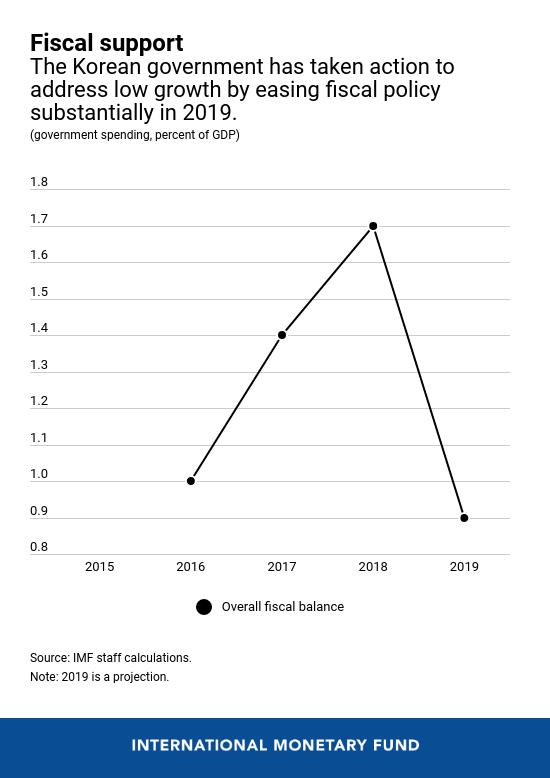 Despite these strong fundamentals, GDP growth dropped to 2.7 percent in 2018 from 3.1 percent in 2017. The global trade slowdown, particularly for semi-conductors, is taking a toll on equipment investment. Export growth is deteriorating on the back of trade tensions and China’s slowdown. Inflation pressures are weak and job creation tepid. Household leverage keeps increasing, albeit at a slower pace, raising concerns about financial risk.