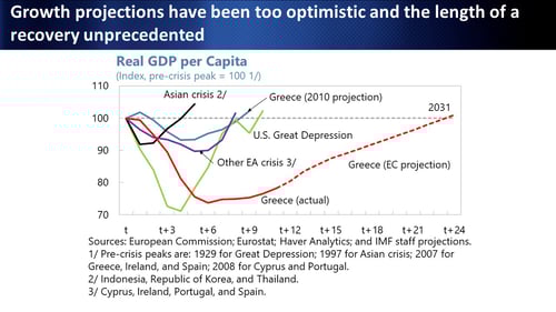Let me begin with a snapshot of where Greece stands today. When designing the program, we realized that the need for a sharp internal devaluation would cause a deep depression. In terms of GDP per capita, we assumed that it would take Greece 8 years to return to pre-crisis level. This was as bad as in the United States Great Depression in the 1930s, and considerably worse than the four years that it took countries affected by the Asian crisis.